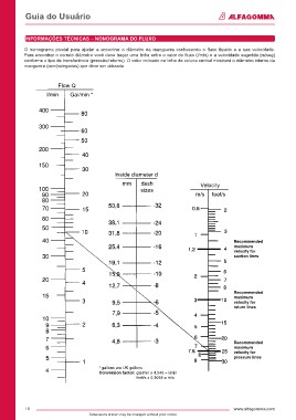 O nomograma pivotal para ajudar a encontrar o diâmetro da mangueira conhecendo o fluxo liquido e a sua velocidade.